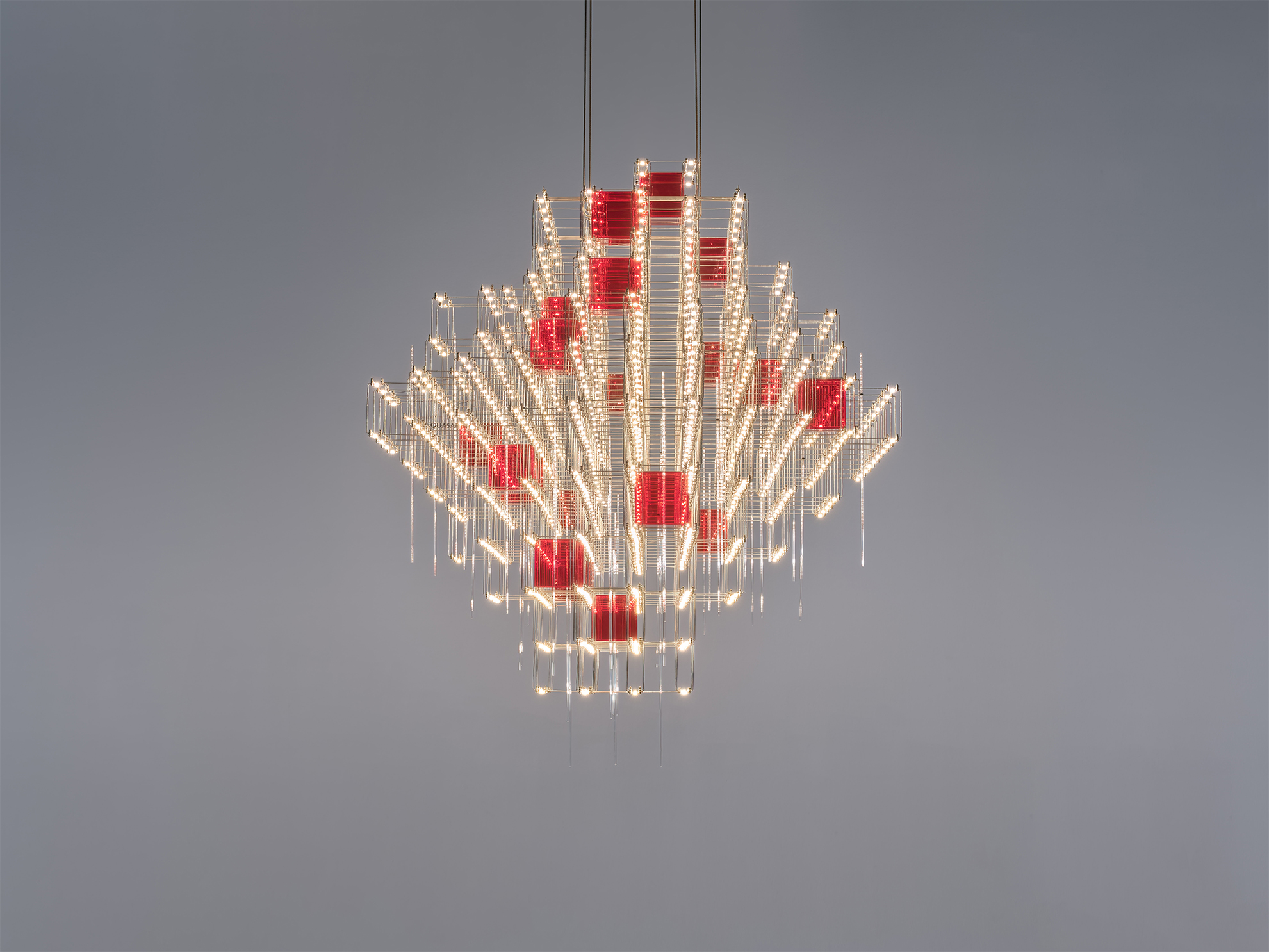 Pollux looks structured but still harmonious. Modular placed LED circuit boards and tiny metal rods are the only two basic elements of this light fixture. They give the lamp its structure and shape. The shape is totally irregular and asymmetrical. The circuit boards have leds on both sides. 2/3 of the light is going downwards and 1/3 is going upwards.