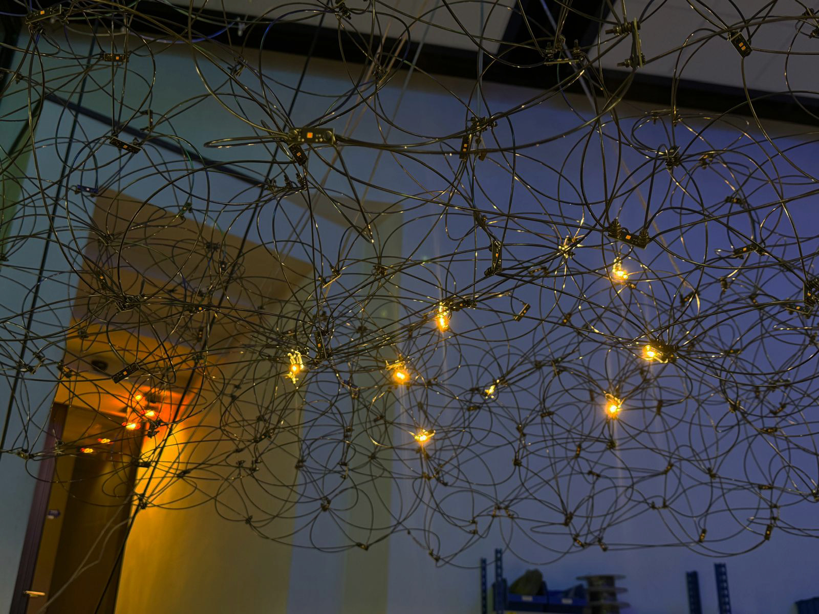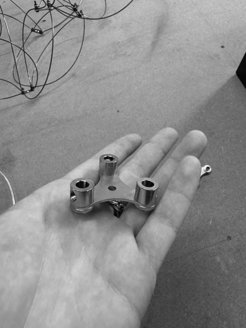 Custom Fixing Method, To combat this, we devised a special suspension method using custom cable blockers to allow the fixture to suspend from three cables, whilst avoiding the cables rubbing against the ceiling rose. All drivers, emergency and control modules could then be placed remotely, above the ceiling (with access from above).