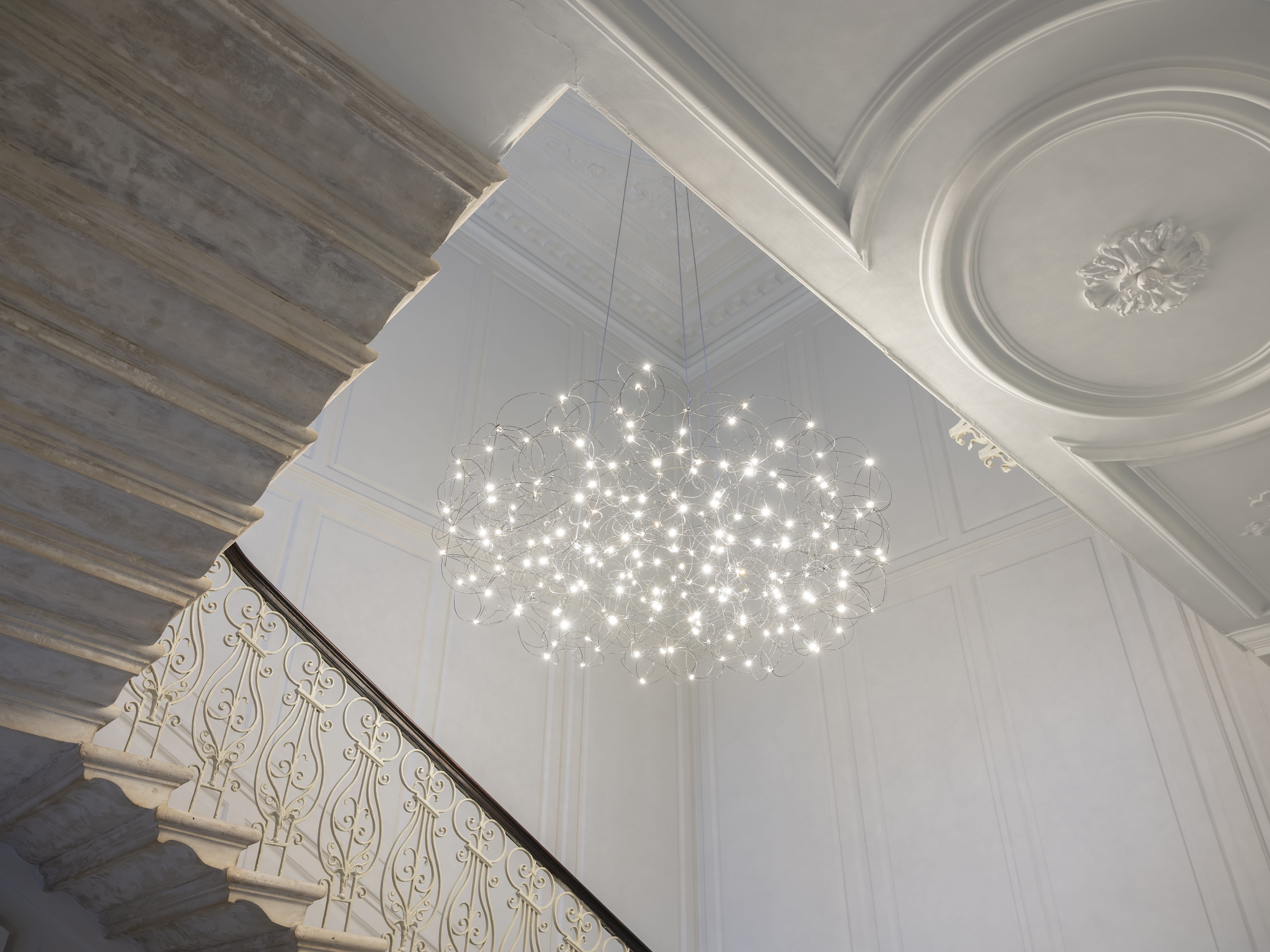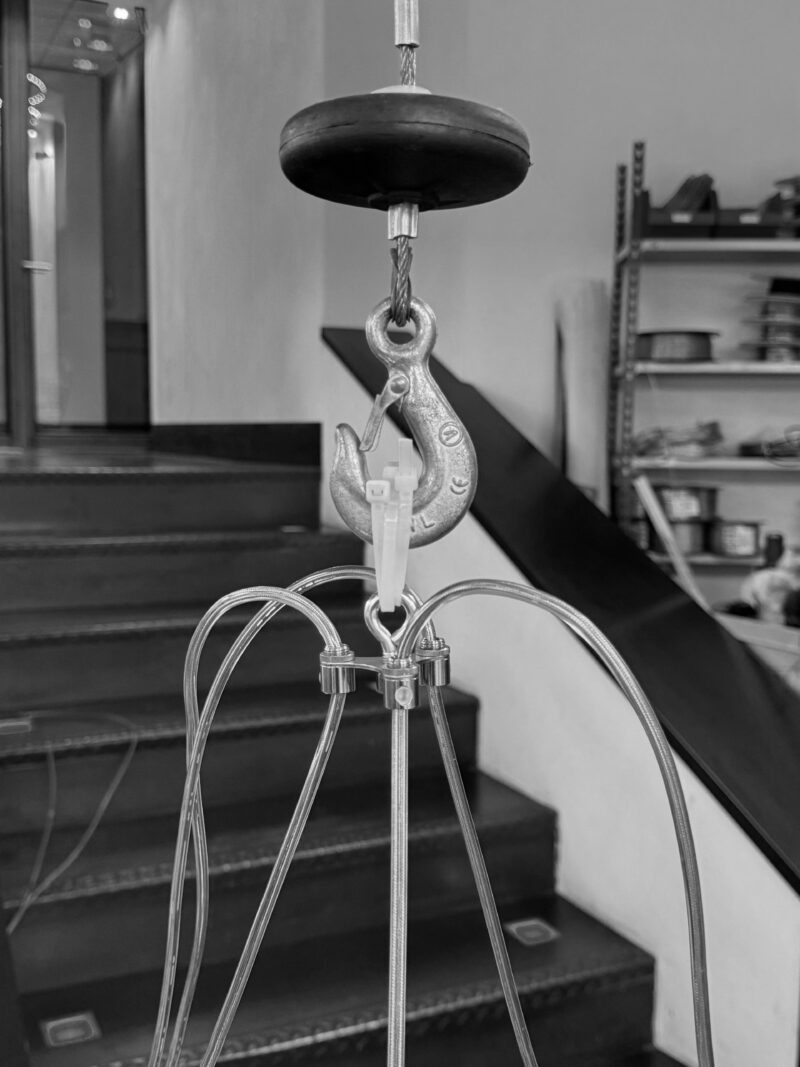 Special parts are made for this suspension to install it as aestheticallypleasing as possible. In addition to the lamp, the ornate ceiling rose should also maintain its attention. Subtlety was a challenge.
